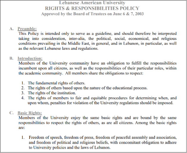 - Freedom of speech, freedom of press, freedom of peaceful assembly and association, and freedom of political and religious beliefs, with concomitant obligation to adhere to University policies and the laws of Lebanon.